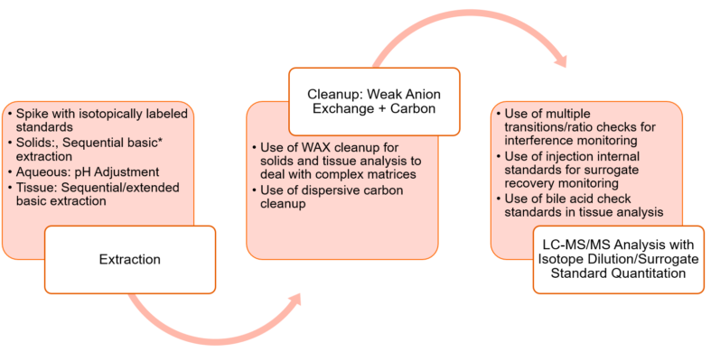 EPA 1633 draft is an isotope dilution LC-MS/MS method for PFAS that incorporates current best practices for PFAS analysis. The method tests for 40 PFAS in wastewater, surface water, groundwater, soil, biosolids, sediment, landfill leachate, and tissue. EPA 1633 is intended to eventually eliminate the use of “modified” drinking water methods and non-standard in-house laboratory standard operating procedures. While broadly conforming to the DoD QSM 5.3 Table B 15 quality framework for PFAS analysis, EPA 1633 standardizes the procedures and extends them to more complex matrices such as wastewater, biosolids, leachate and tissue.