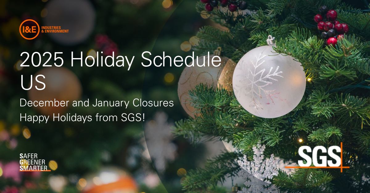 SGS North America Inc., Industries & Environment laboratories will be closed on Thursday, December 25th, 2025, for Christmas Day and on Thursday, January 1st, 2026, for New Year’s Day, but will maintain normal business hours on the days before and after the holidays. We will be accepting samples until 12:00 PM on December 24th.