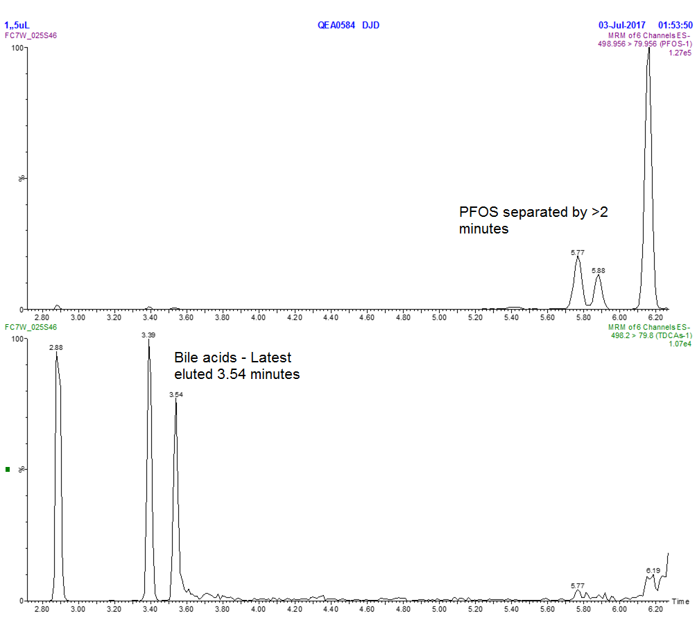 • The only guaranteed solution in unit resolution LC-MS/MS is to separate these interferences chromatographically. As shown in the image below, the default PFAS method run at SGS AXYS separates the bile acids from PFOS by more than 2 minutes, which is a very long time in the high-efficiency separation world of UPLC. This is the 100% error-free option, no chance of interference whatsoever. The SGS AXYS method does not start acquiring PFOS transitions till well after the bile acids elute.
