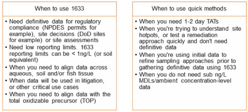 As the demand for PFAS measurement continues to grow with labs still trying to meet capacity needs, we understand that time is of the essence from sampling to result. In an ideal scenario, obtaining definitive data at the lowest reporting limits would be as simple as pointing a tricorder. While the lab community is working towards that goal, there are currently choices to be made between quick PFAS methods and EPA 1633.