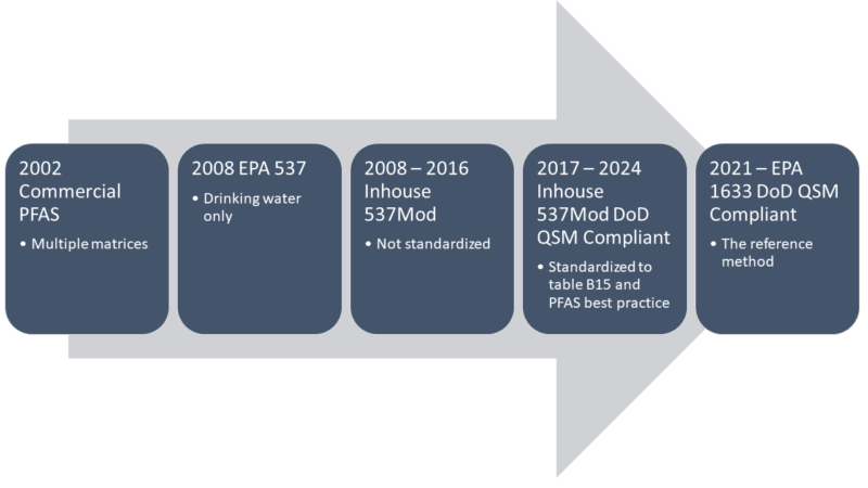 We created this helpful graphic to track the evolution of PFAS methods since PFAS analysis became commercially available in the early 2000s. It’s an interesting history (Read on below the summary and stay or the much longer history!)