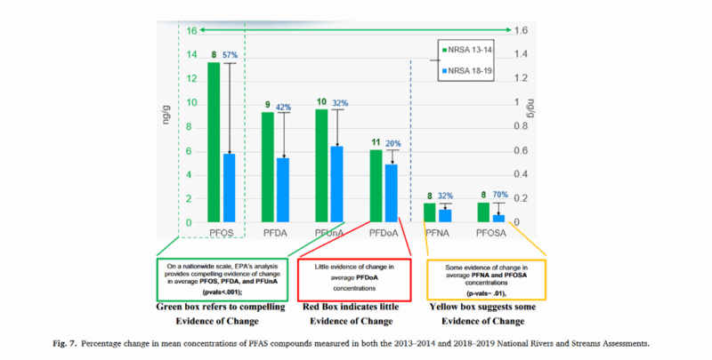 In good news, the concentrations of measured PFAS are declining. Compared to the previous survey, PFOS dropped by 57%, PFDA by 41%, PFUnA by 32%, and PFDoA by 20% reflecting the move away from use of longer-chain PFAS. That’s good news. But as always with PFAS, the story is in the details. The authors find that percentage declines correlated inversely with chain length, that is, C8 (PFOS) declined much more than C11 (PFDoA) reflecting lower water solubility and greater propensity for accumulation in tissue for longer-chain compounds.