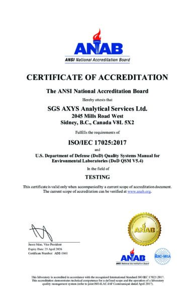 SGS AXYS ANAB US DoD cert and scope