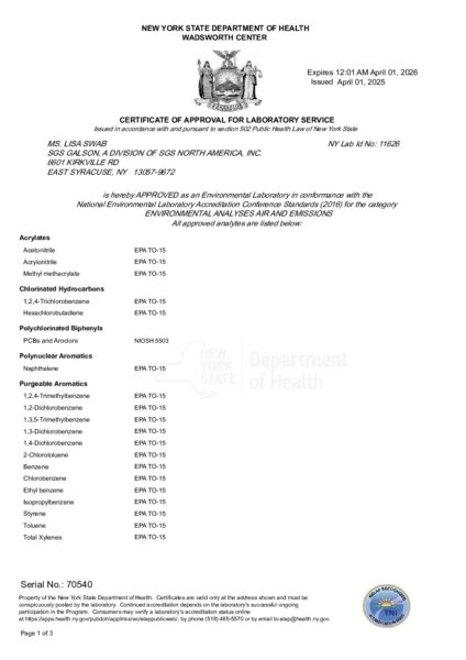 SGS Galson NYS DOH ELAP Environmental Analyses Air and Emissions