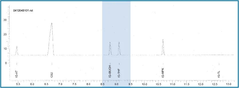 The chromatogram from the second column shows the same two compounds (retention times 8.78 and 9.10 minutes) with base line separation. Using the second column, both compounds can be identified and quantified with greater confidence.