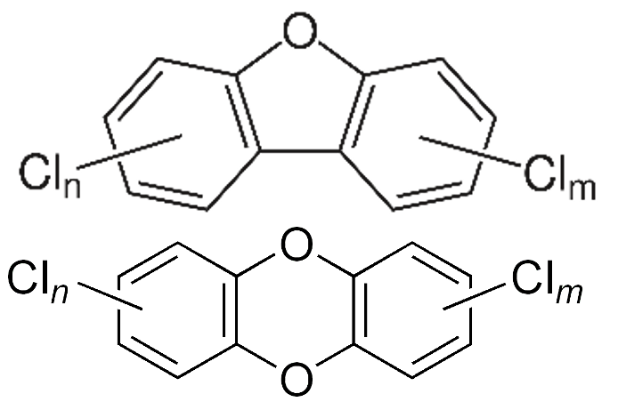 Polychlorinated dibenzo-p-dioxins (PCDDs) and dibenzofurans (PCDFs) also known as dioxins and furans are persistent, bioaccumulative and toxic organic pollutants listed in the Stockholm Convention. Of the 210 possible dioxin and furan structures, 17 with chlorines in the in the 2,3,7, and 8 positions are considered the most toxic and are reported individually.